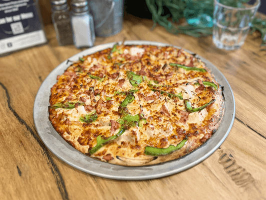 Satay Sauce, Bacon, Chicken, Mozzarella Cheese, Capsicum (Fresh) and Onion.