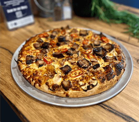 Korean BBQ Sauce, Pork Belly, Mozzarella Cheese, Mushrooms, Zucchini and Chilli Flakes.