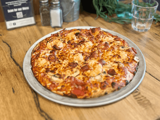 Tomato Sauce, Cabanossi, Ham, Prawn, Mushrooms and Mozzarella Cheese.